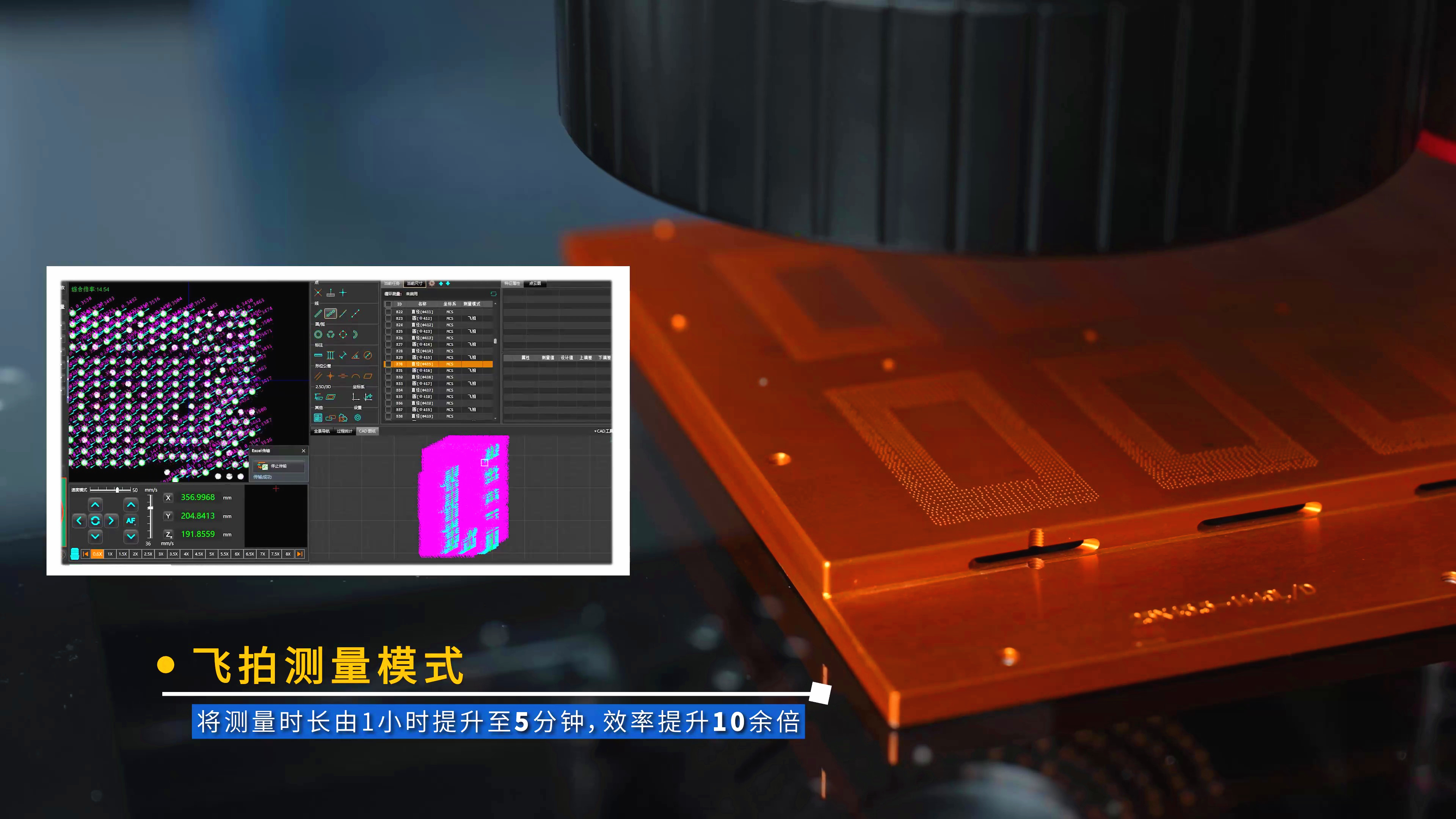 Novator系列全自动影像仪飞拍测量充分发挥其优势,对比传统影像测量仪,测量时长由 1小时缩短至 5 分钟,测量效率提升 10 余倍。