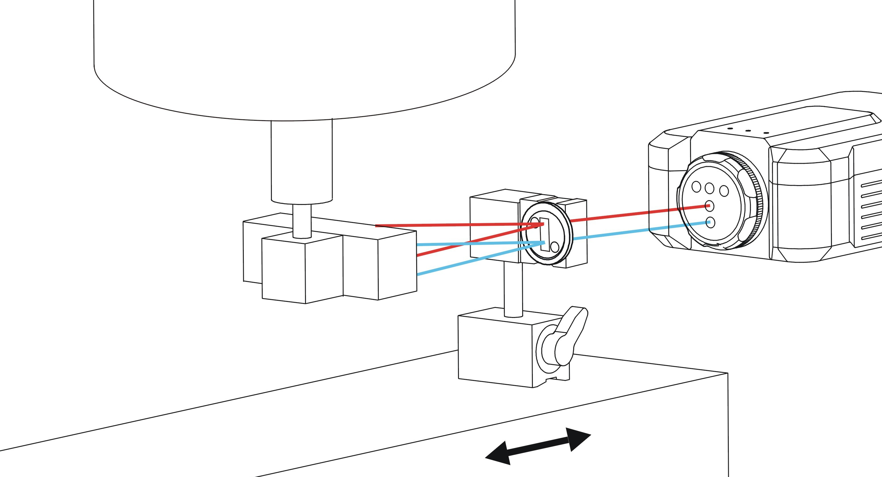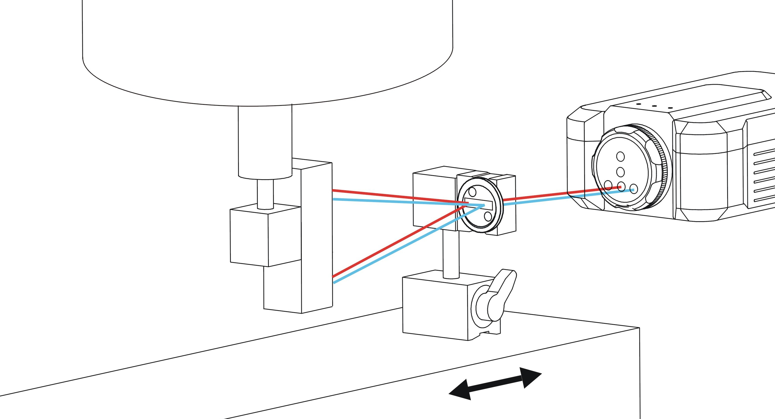 原理:带有圆孔的是直线度干涉镜,其与待测轴相连一同运动;长条镜是直线度反射镜静止安装,其是对称结构,上下左右均对称。当一束激光从源头发出射入干涉镜,干涉镜将光束分成两束,形成一个很小的角度分别去往反射镜,由于反射镜上下对称,因此两束光被反射后又回到干涉镜,汇合成一股光束,去往激光头的探测器。当运动轴产生直线度误差时,会使得干涉镜相对于反射镜在水平横向方向发生相对运动,而反射镜是左右对称的(左右的镜片不在同一平面,有一定的角度),因此会使得两束分开的光束光程具有差别,根据此差别,即可测得运动轴产生的直线度误差。