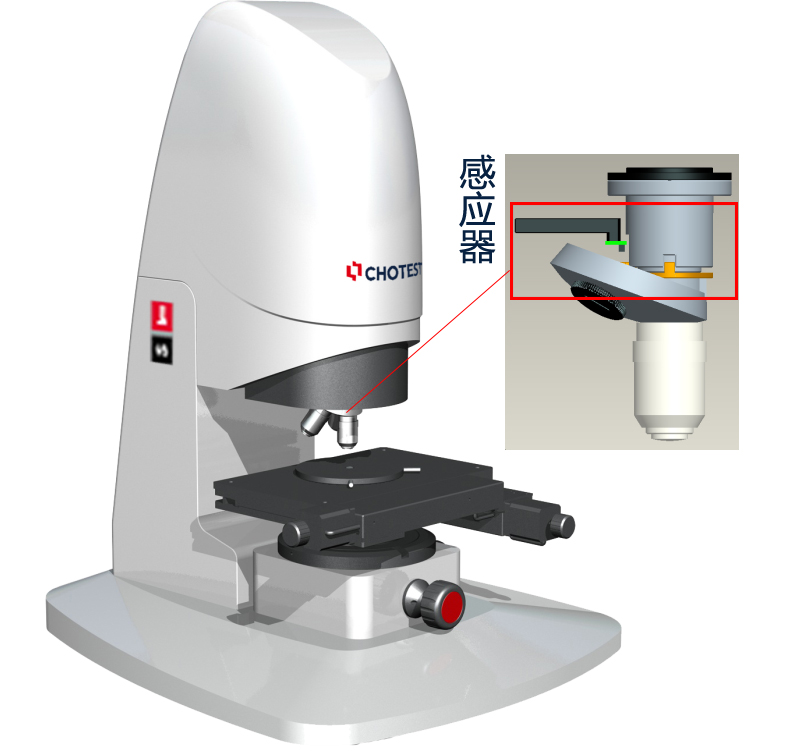 在镜头的上方安装有机械防撞传感器,当镜头向下位移与样品表面直接接触时,触发感应器,镜头与样品表面变为软接触,并触发紧急停止开关,不再响应向下位移的指令,有效的避免镜头和样品的损伤,如以下动图所示: