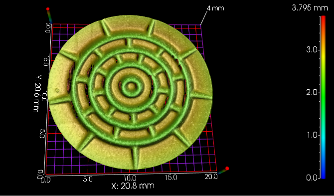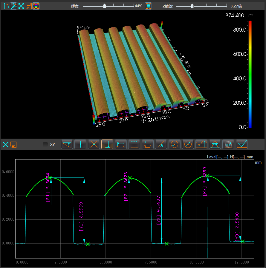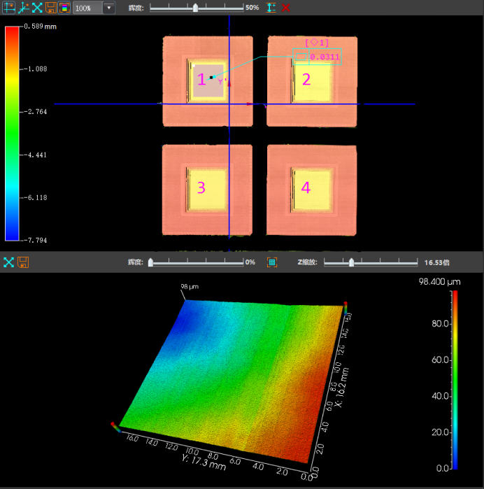 上图展示的是工件的三维形貌,VJ系列3D轮廓测量仪能在几秒钟之内超高精度地呈现目标工件的真实形状,最后呈现不同颜色变化的3D图像是软件利用高度测量数据形成的高低差来显示的,软件可以选择相应测量面,快速得到最高点和最低点信息。