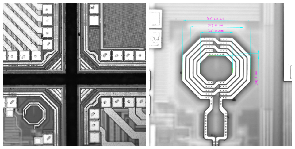 VT6000系列共聚焦显微镜具有优异的光学分辨率,通过清晰的成像系统能够细致观察到晶圆表面的特征情况,例如:观察晶圆表面是否出现崩边、刮痕等缺陷。电动塔台可以自动切换不同的物镜倍率,软件自动捕捉特征边缘进行二维尺寸快速测量,从而更加有效的对晶圆表面进行检测和质量控制。