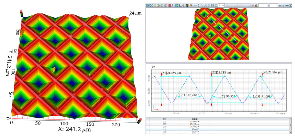 电子蓝颜gtv中一些光学薄膜表面存在一些特殊的微结构,这些结构表现为窄而深的“V形”、“金字塔”。白光干涉仪在测量此类结构时,由于形貌陡峭、角度大,无法形成干涉条纹信号,或条纹宽度过窄而无法准确地解调出深度信息。VT6000系列共聚焦显微镜基于针孔点光源的共轭共焦原理,其依托弱光信号解析算法可以完整重建出近70°陡峭的复杂的结构形状。