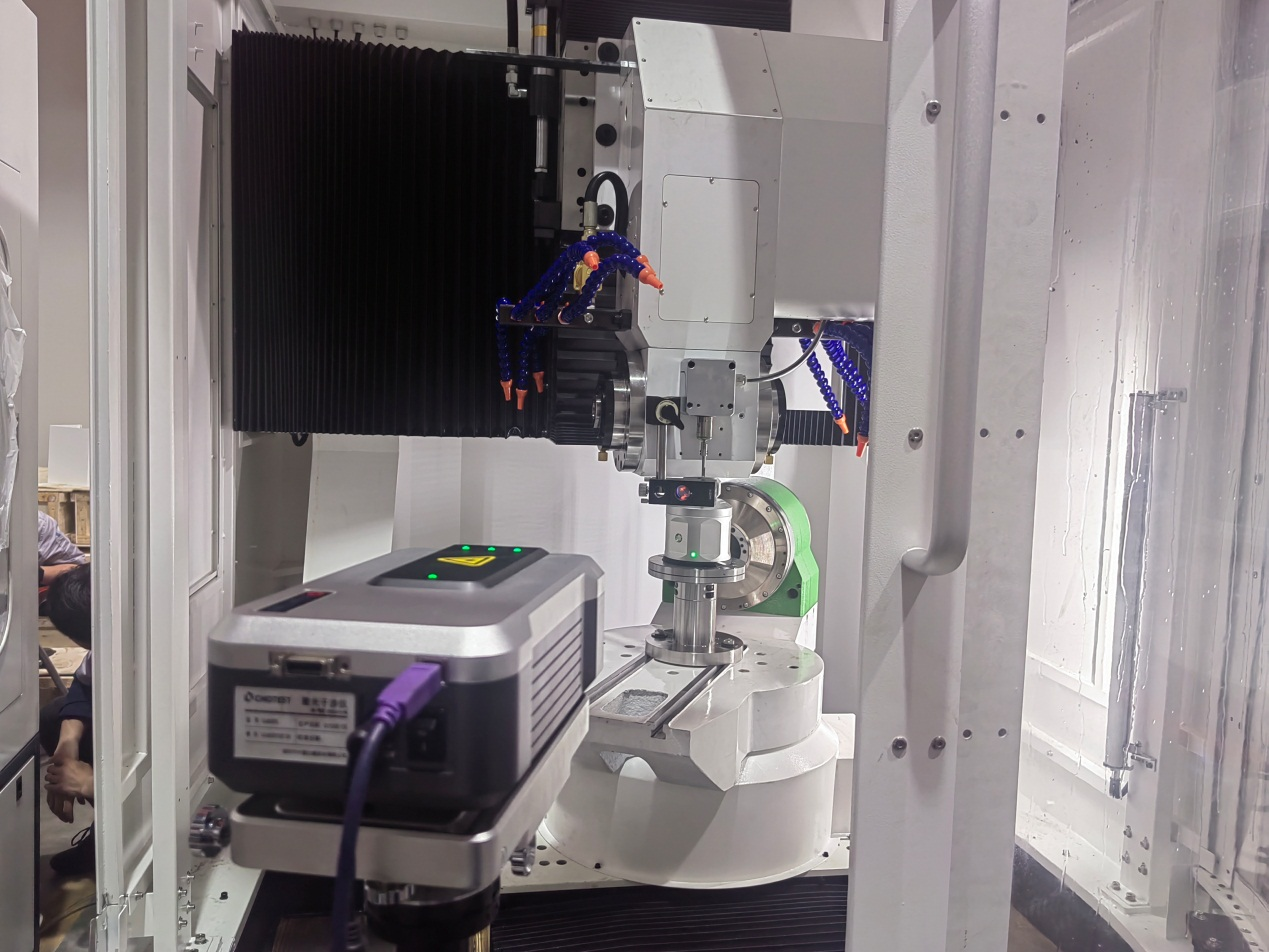 上图为数控工具磨床旋转轴B轴/C轴定位以及重复定位精度检测,SJ6000激光干涉仪+WR50自动精密转台测量并补偿,BC轴定位精度(执行标准GB/T17421.2)0.002度内,重复定位精度0.001度内,数据补偿可以有效提升旋转轴旋转角度精度。