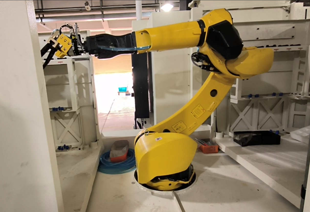 广东某公司,专业生产自动化设备零部件,现场使用855中型立式加工中心(FANUC 0I MF-PLUS数控系统),直线导轨式机器人加零点定位工装夹具,配置MES控制管理系统。