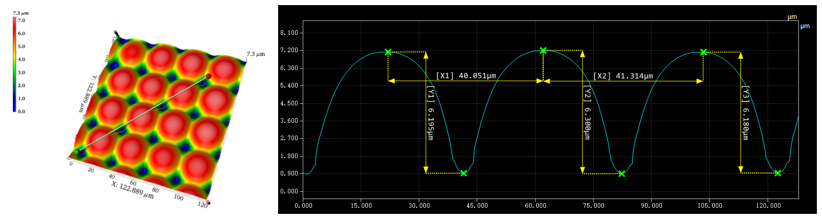共聚焦显微镜可以对光学微透镜阵列三维形貌进行重建,检测表面是否存在微缺陷,自动分析透镜矢高半径等参数,验证其是否符合预期标准。