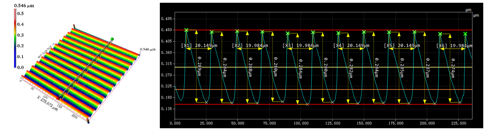 共聚焦显微镜可以对光栅式图样进行3D检测,自动测量分析光栅深度和周期性间隔,监控光栅关键尺寸良率。
