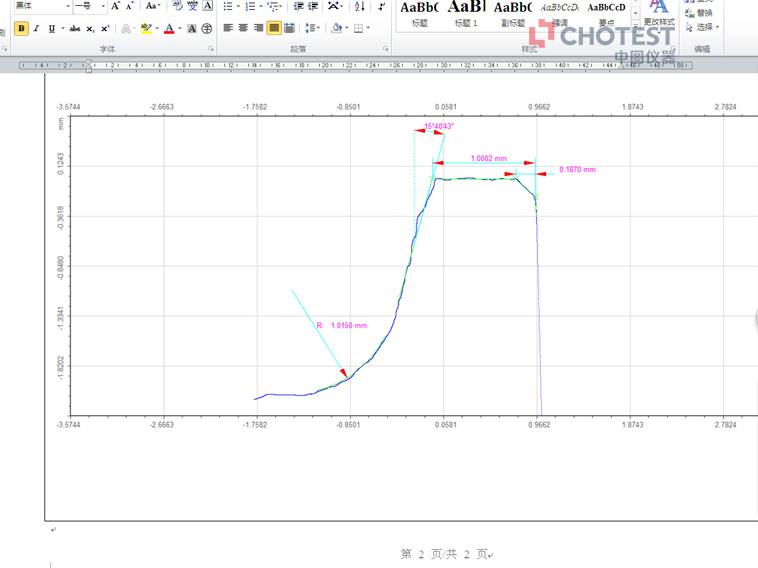 紧接着就是实物测量过程,把定制的测针安装到SJ5760轮廓测量仪上,并对测针进行相关参数调试后,实物测量就正式开启,随着测针在工件的沟槽内有条不紊地行进扫描,检定软件将测针扫描的相关数据绘制在计算机屏幕中,形成一幅精美的二维效果分析图。