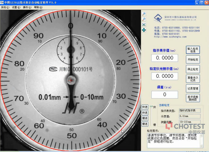 3.点击“确定”,到达开始检定界面,这时候计算机屏幕上会出现一个带有刻度的红圈中心有个小十字,红圈下可以看到百分表的表盘,此时调整摄像机的位置,使表面外圈刻度线位于红色圆圈的范围之内,再调整摄像机的亮度和对焦,使表盘上的信息能够在计算机屏幕上清晰显示。点击“快进”、“快退”键把百分表指针移到“0”位左边,再使用“慢进”微调指针对准零位。