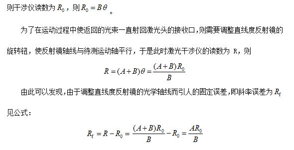 根据直线度误差测量原理可知,测量过程中不可避免的会引入斜率误差。该误差是由于测量直线度反射镜的光学轴线最初与待测轴不平行,为调整平行而引起的。如图 所示,A 为干涉镜和反射镜的距离,B 为激光头到干涉镜的距离(其中干涉镜是固定在运动轴上的)。在一开始,反射镜的光学轴线处于旋转前的位置,而由于机床运动轴与其之间存在的夹角θ,