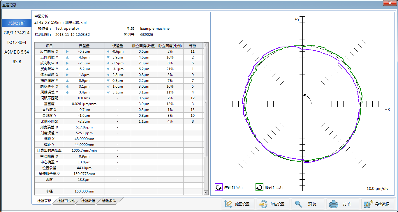 采集的数据用于根据GB 17421-4、ISO 230-4、ASME B5.54等国际标准计算位置精度的总体测量值(圆度、圆度偏差),数据以图形和数字的格式显示。用中图蓝颜gtv 分析报告帮助并支持故障诊断。