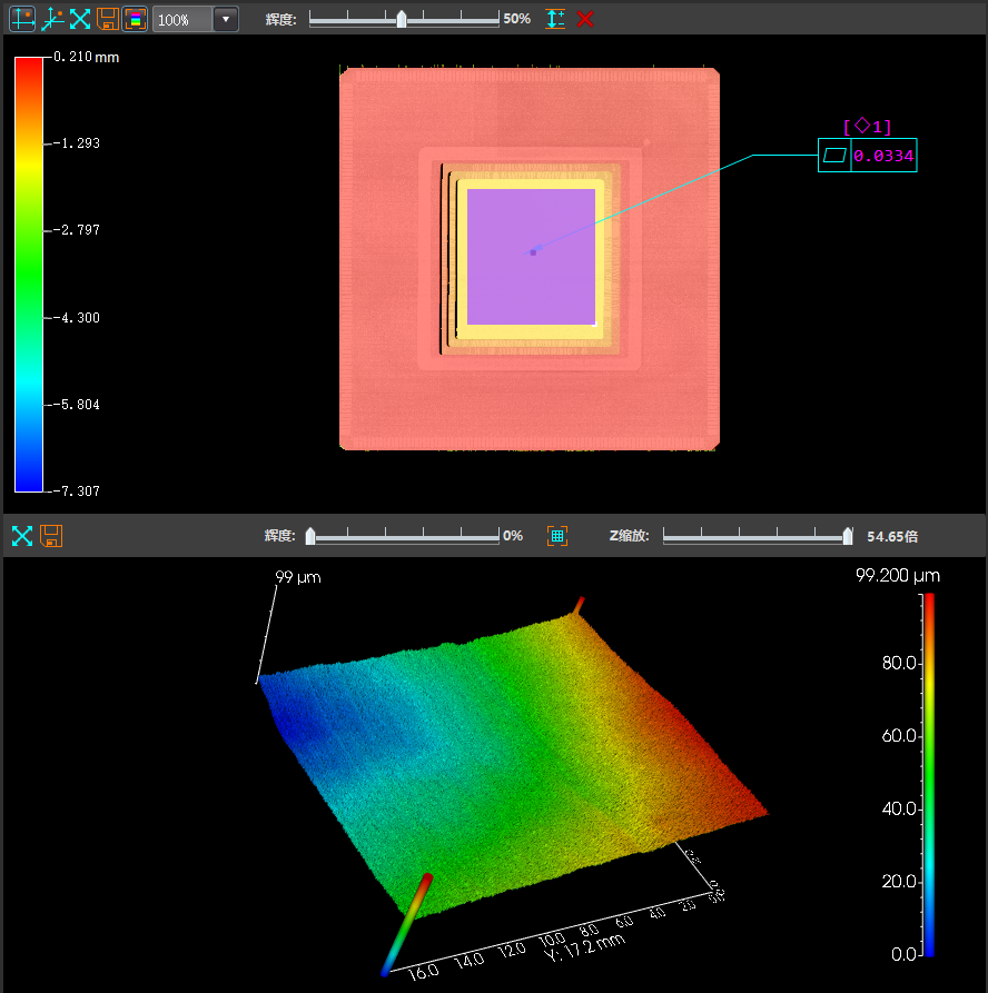 上图展示的是工件的三维形貌,VJ系列3D轮廓测量仪能在几秒钟之内超高精度地呈现目标工件的真实形状,最后呈现不同颜色变化的3D图像是软件利用高度测量数据形成的高低差来显示的,软件可以选择相应测量面,快速得到最高点和最低点信息。