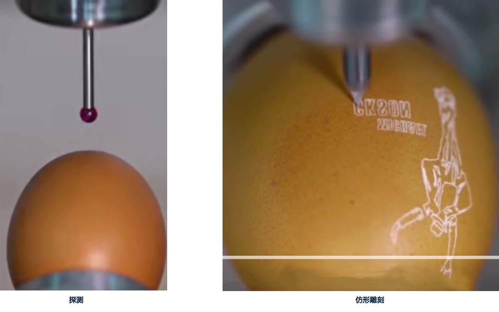 鸡蛋壳约0.2mm厚,且外形各异,常规加工流程无法在鸡蛋上进行雕刻,因为蛋壳太薄很容易刻破,所以我们利用测头探测实际数据拟合好平面,再根据实际平面来做仿形加工,可以很好地解决蛋壳雕刻问题。