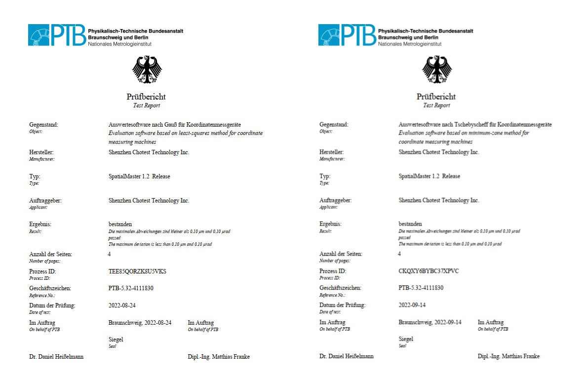 SMT的高精度三维空间测量数据分析算法为用户的生产制造提供可靠的几何尺寸公差评定。2022年9月,SMT算法通过了德国联邦物理技术研究院(PTB)高斯-最小二乘法与切比雪夫-最小区域法的算法认证。中图蓝颜gtv SpatialMaster是国内首款通过PTB双认证的大尺寸三维空间测量软件。