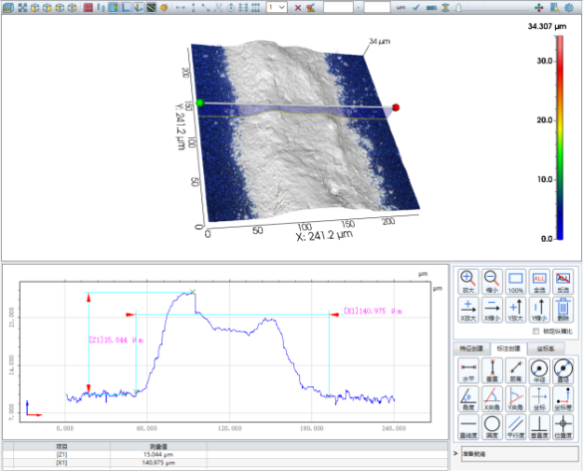 在太阳能电池制作工程中,栅线的高宽比决定了电池板的遮光损耗及导电能力,直接影响着太阳能电池的性能。共聚焦显微镜可以对栅线进行快速检测,软件具备对视场内的栅线自动测量功能,能够对扫描获取的三维轮廓进行多剖面分析,计算出每个剖面的栅线高度及宽度尺寸。