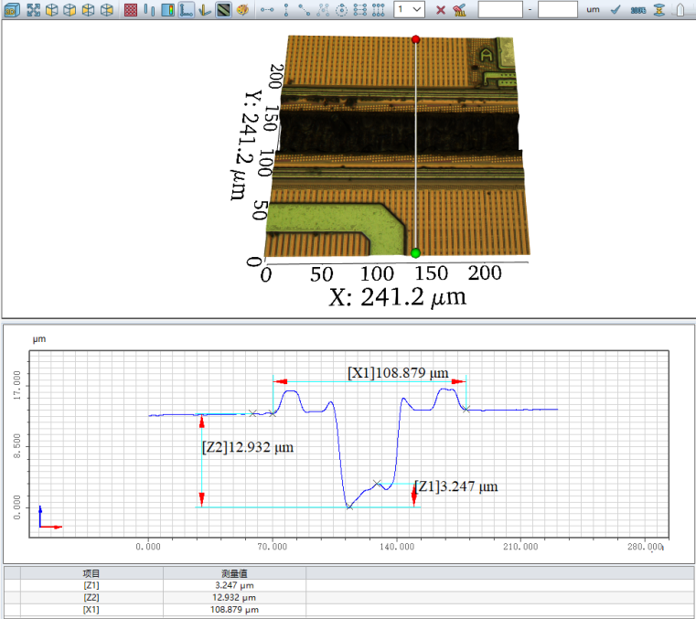 在对晶圆进行激光切割的过程中,需要进行精准定位,以此来保证能在晶圆上沿着正确的轮廓开出沟槽,通常由切割槽的深度和宽度来衡量晶圆分割的质量。VT6000系列共聚焦显微镜,其以共聚焦技术为原理,配合高速扫描模块,专业的分析软件具有多区域、自动测量功能,能够快速重建出被测晶圆激光镭射槽的三维轮廓并进行多剖面分析,获取截面的槽道深度与宽度信息。