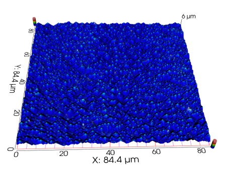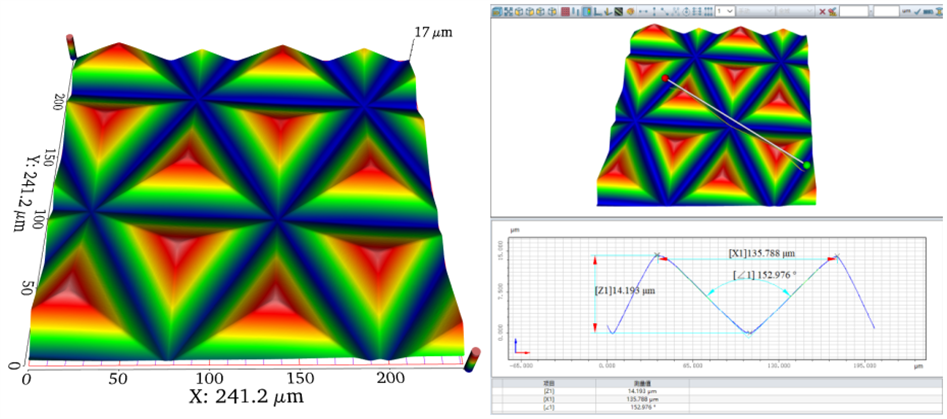 电子蓝颜gtv中一些光学薄膜表面存在一些特殊的微结构,这些结构表现为窄而深的“V形”、“金字塔”。白光干涉仪在测量此类结构时,由于形貌陡峭、角度大,无法形成干涉条纹信号,或条纹宽度过窄而无法准确地解调出深度信息。VT6000系列共聚焦显微镜基于针孔点光源的共轭共焦原理,其依托弱光信号解析算法可以完整重建出近70°陡峭的复杂的结构形状。