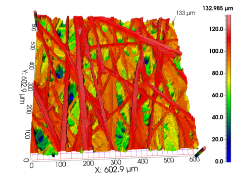 碳纤维纸类的表面反射率极低,结构复杂且呈立体状。白光干涉仪因其对样品表面反射形成的干涉条纹光信号对比度要求较高,而碳纸表面纤维丝的立体角度大,导致部分位置因反射率极低形成的干涉条纹对比度较低甚至无法形成干涉条纹,从而难以解调出深度信息。VT6000系列共聚焦显微镜在此展现出其特有的弱光信号解析能力优势,对样件表面的低反射率特性适应能力更强。