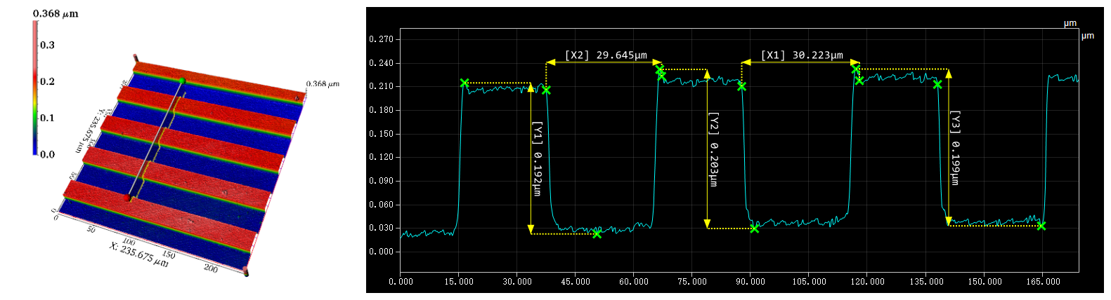 共聚焦显微镜可以对光栅式图样进行3D检测,自动测量分析光栅深度和周期性间隔,监控光栅关键尺寸良率。