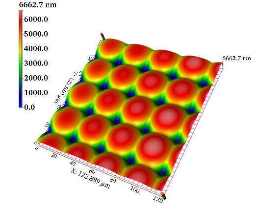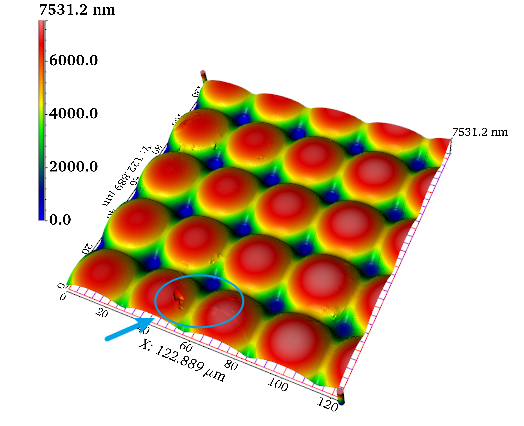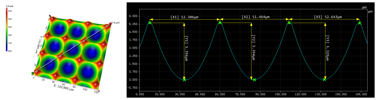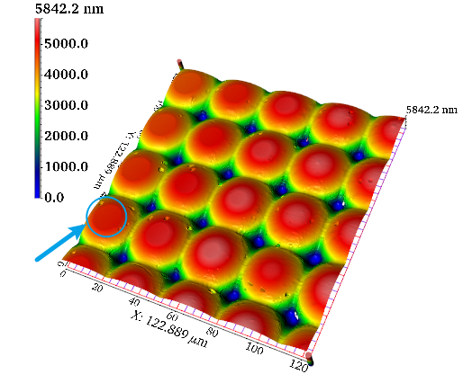 共聚焦显微镜可以对光学微透镜阵列三维形貌进行重建,检测表面是否存在微缺陷,自动分析透镜矢高半径等参数,验证其是否符合预期标准。