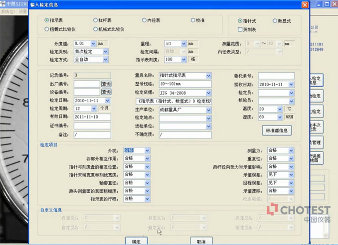 2.在计算机检定软件上点击“输入检定信息”按钮,然后按要求选择被检百分表的参数和检定规程,顺序依次为,选择“指示表、指针式、分度值0.01mm,量程50mm,检定类别选择“首次检定”,检定方式选择全自动,指示表刻度选择100格,选择检定规程等信息;