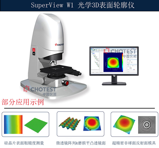 SuperView W1 光学3D表面轮廓仪采用光学非接触式测量方法,以白光干涉技术为原理,对硅晶片、微透镜阵列磨损平凸镜面及棱镜平面等进行表面形貌特征测量和分析。